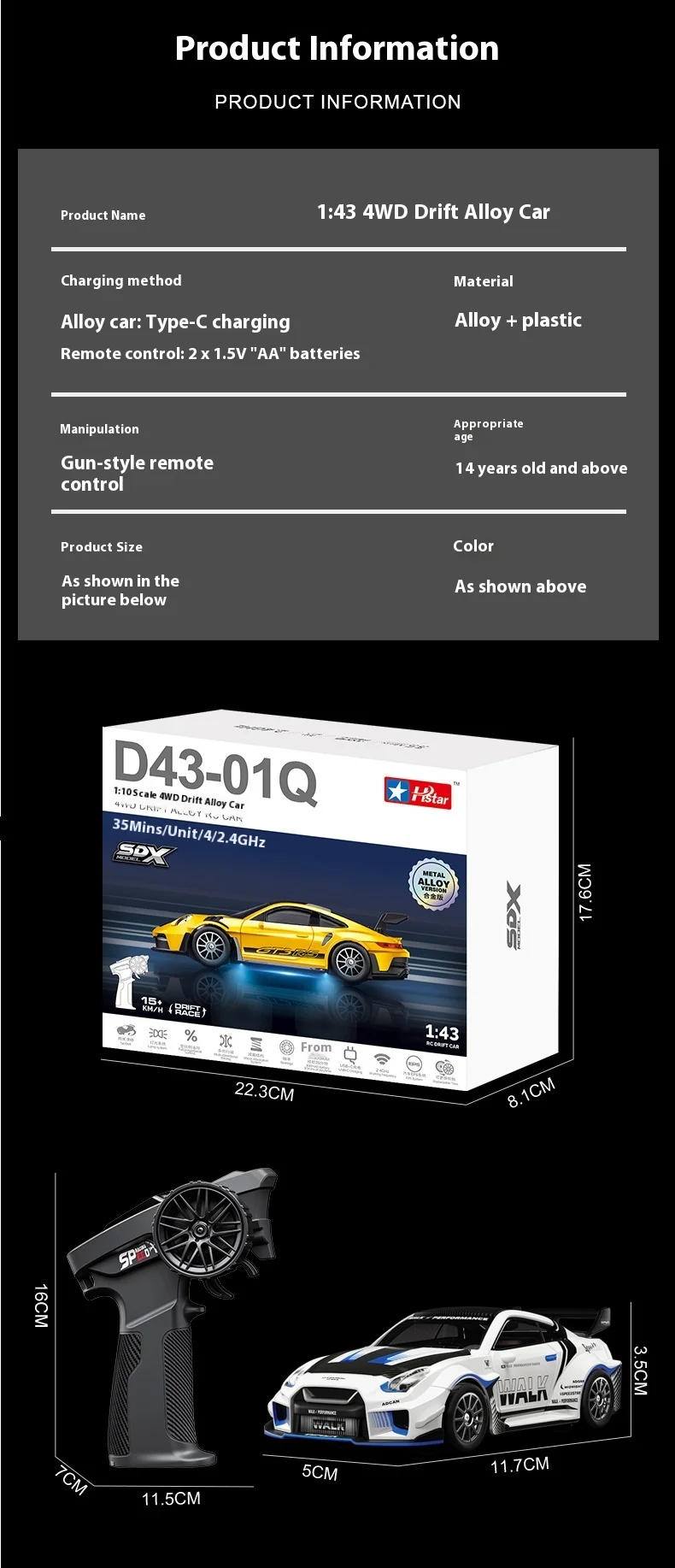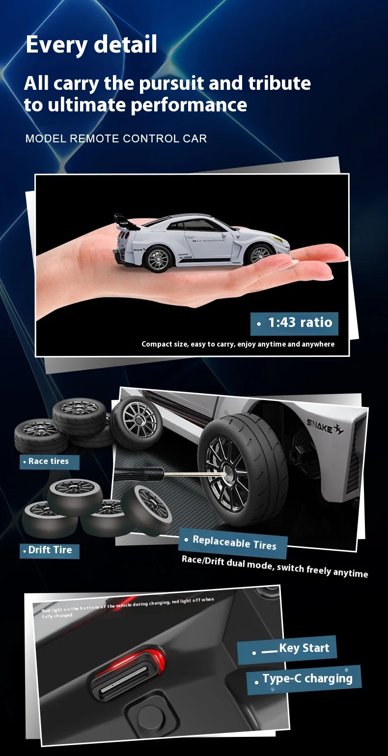 1/43 RC Car RC Drift Car with ESP Gyroscope Full Proportional Control 4WD Metal Body 2 Sets Tires Realistic Drifting Kids Gift