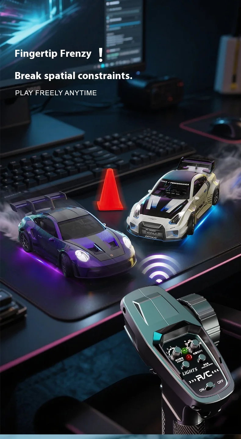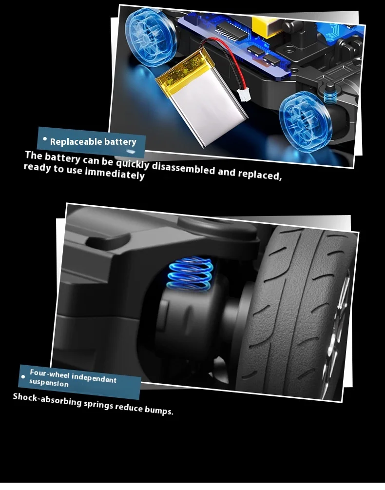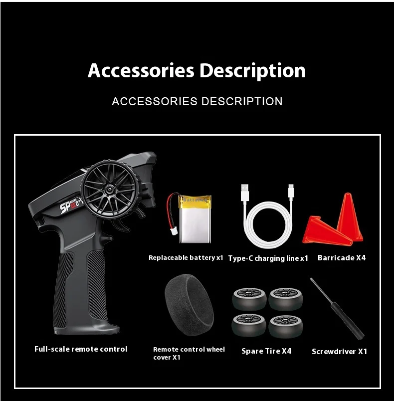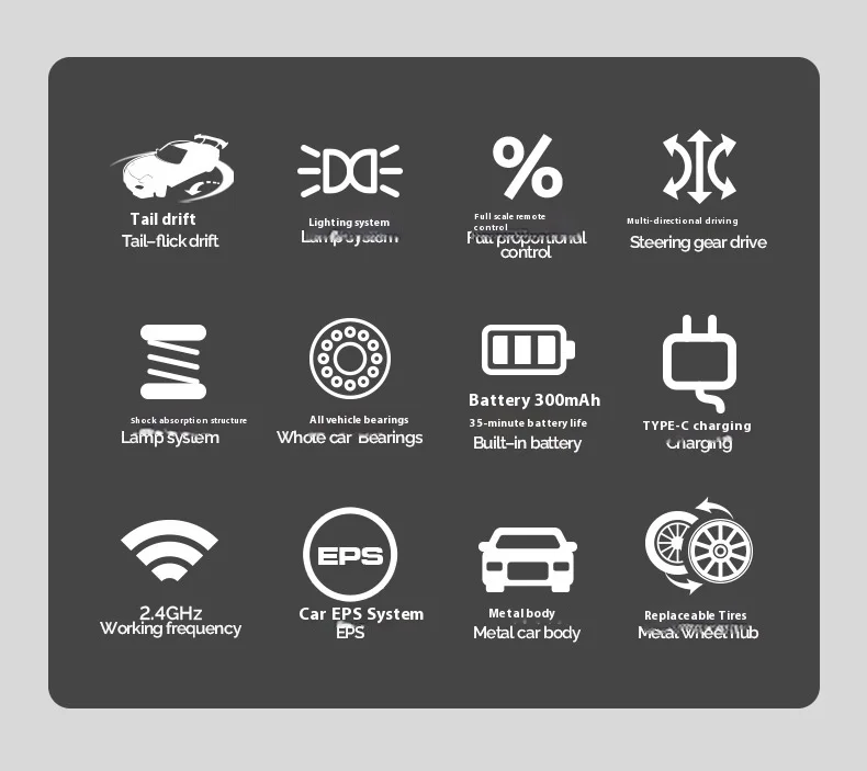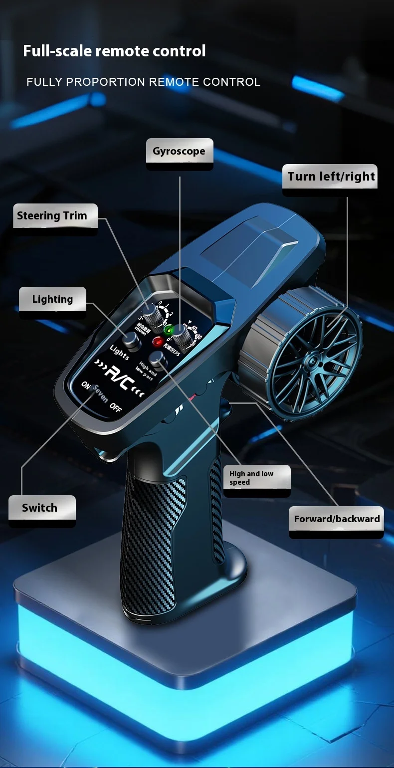 转向:3线2克舵机/驱动:N20铁芯电机,全车采用静音轴承。全比例电子转向比例调节,陀螺仪感度调节,速度调节,前后/底盘 灯光可控