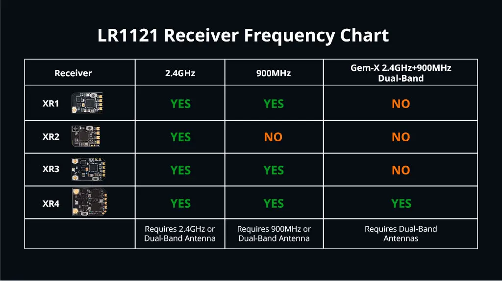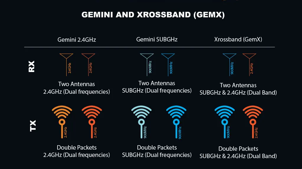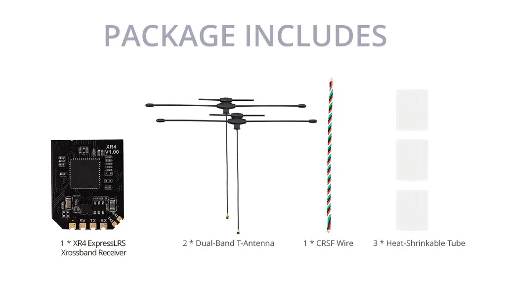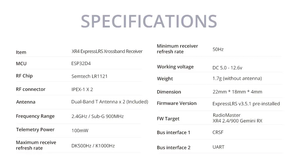 Introducing the XR4 XrossBand Receiver – The Pinnacle of compact Dual-Band PerformanceThe XR4 Receiver is a cutting-edge true diversity dual-band receiver featuring dual LR1121 RF transceivers, designed to leverage the advanced ExpressLRS Gemini Xrossband protocol (Gem-X). It seamlessly supports both the 2.4GHz and Sub-G 900MHz bands, and its dual T-type antennas provide superior reception sensitivity and connection stability for optimal performance.Built with two independent RF circuits, the XR4 offers versatile operation modes, allowing you to switch between Gemini single-frequency or Xrossband dual-band modes, and can be tailored to your specific needs. The integrated Wi-Fi module simplifies firmware updates and configuration via a user-friendly WebUI on your PC or mobile device.With ultra-low latency and a high refresh rate, the XR4 excels in delivering a stable, rock-solid RF link, even in demanding long-range or challenging environments. Its compact, lightweight design is perfect for drones, and fixed-wing models, offering reliable connectivity in critical situations where every signal matters. The XR4 ensures you maintain the most secure and robust RF link available, providing unbeatable reliability in the most demanding conditions.For more details and support, visit expresslrs.org.FeaturesTrue Diversity & Dual-BandUnmatched reliability with ExpressLRS Gemini XrossbandCompatible with ExpressLRS 2.4GHz, Sub-G 900MHz, Gemini & Gemini Xrossband (Gem-X)ESP32D4 high-performance MCUTwin Semtech LR1121 TransceiverSecondary UART port for advanced functionalityCastled pads for easy solderingSpecificationItem: XR4 Gemini Xrossband Dual-Band ReceiverMCU: ESP32D4RF Chip: LR1121 x 2RF connector: IPEX-1 X 2 Antenna: Dual-Band T Antenna x 2 (Included)Frequency Range: 2.4GHz / Sub-G 900MHzTelemetry Power: 100mwMaximum receive refresh rate: DK500Hz / K1000HzMinimum receiver refresh rate: 50HzWorking voltage: DC 4.5-8.4VWeight: 1.7g (without antenna)Dimension: 22mm * 18mm * 4mmFirmware Version: ExpressLRS v3.5.1 pre-installedFW Target: RadioMaster XR4 2.4/900 Gemini RXBus interface 1: CRSF Bus interface 2: UARTPackage Includes1 * XR4 Gemini Xrossband Dual-Band Receiver2 * Dual-Band T-Antenna1 * CRSF Wire3 * Heat-Shrinkable Tube1 * Manual Card