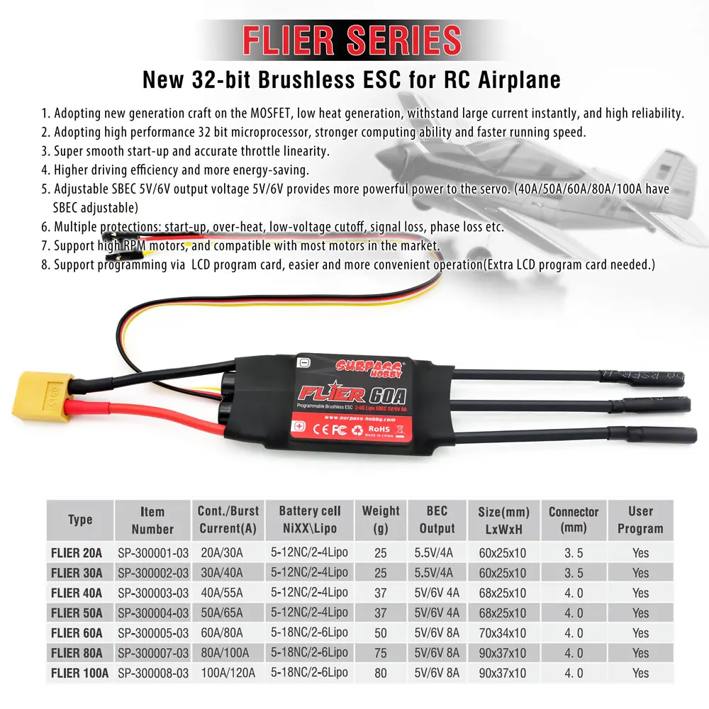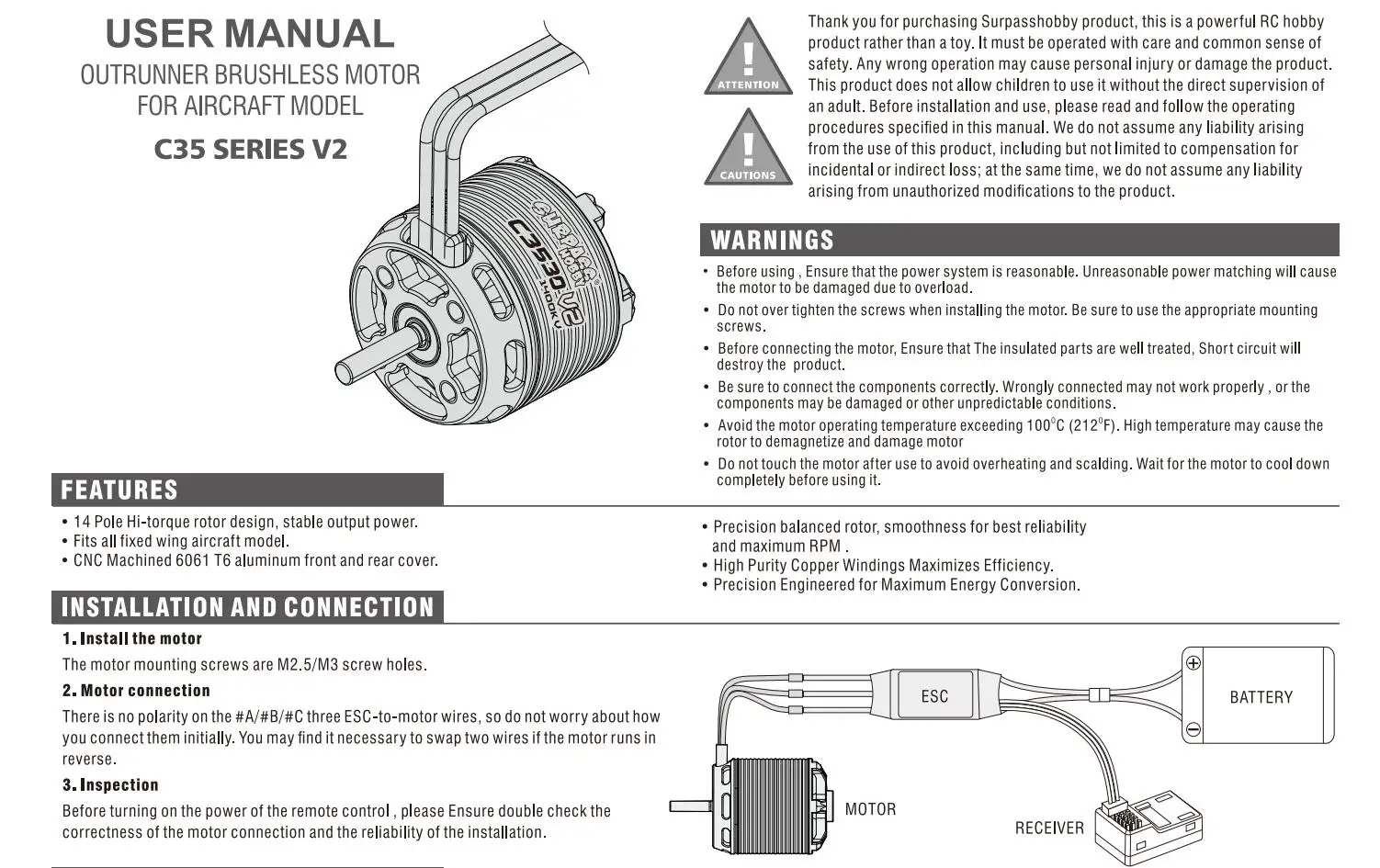 Surpass Hobby C3530 C3536 C3542 C3548 V2 Brushless Outrunner Motor 2-5S with 40A 50A 60A Brushless ESC For RC Aircraft Drone