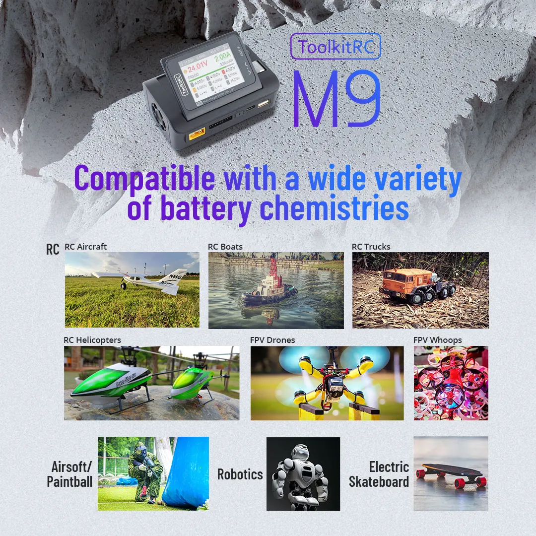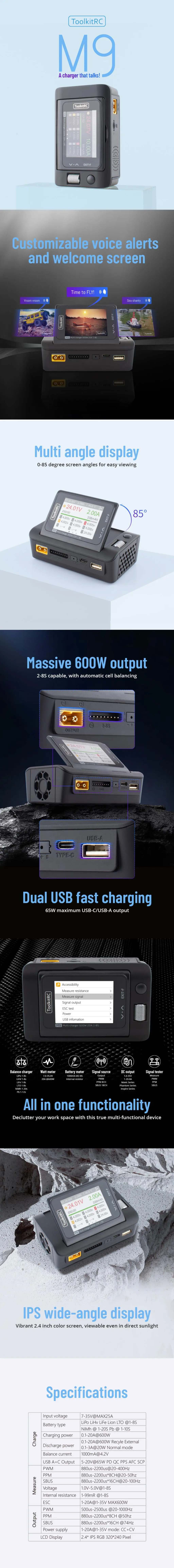 ToolkitRC M9 600W USB Fast Charing DC Smart Charger with Audio Function Adjustable Screen Angle For 1-8S Lipo LiHv LiFe Battery